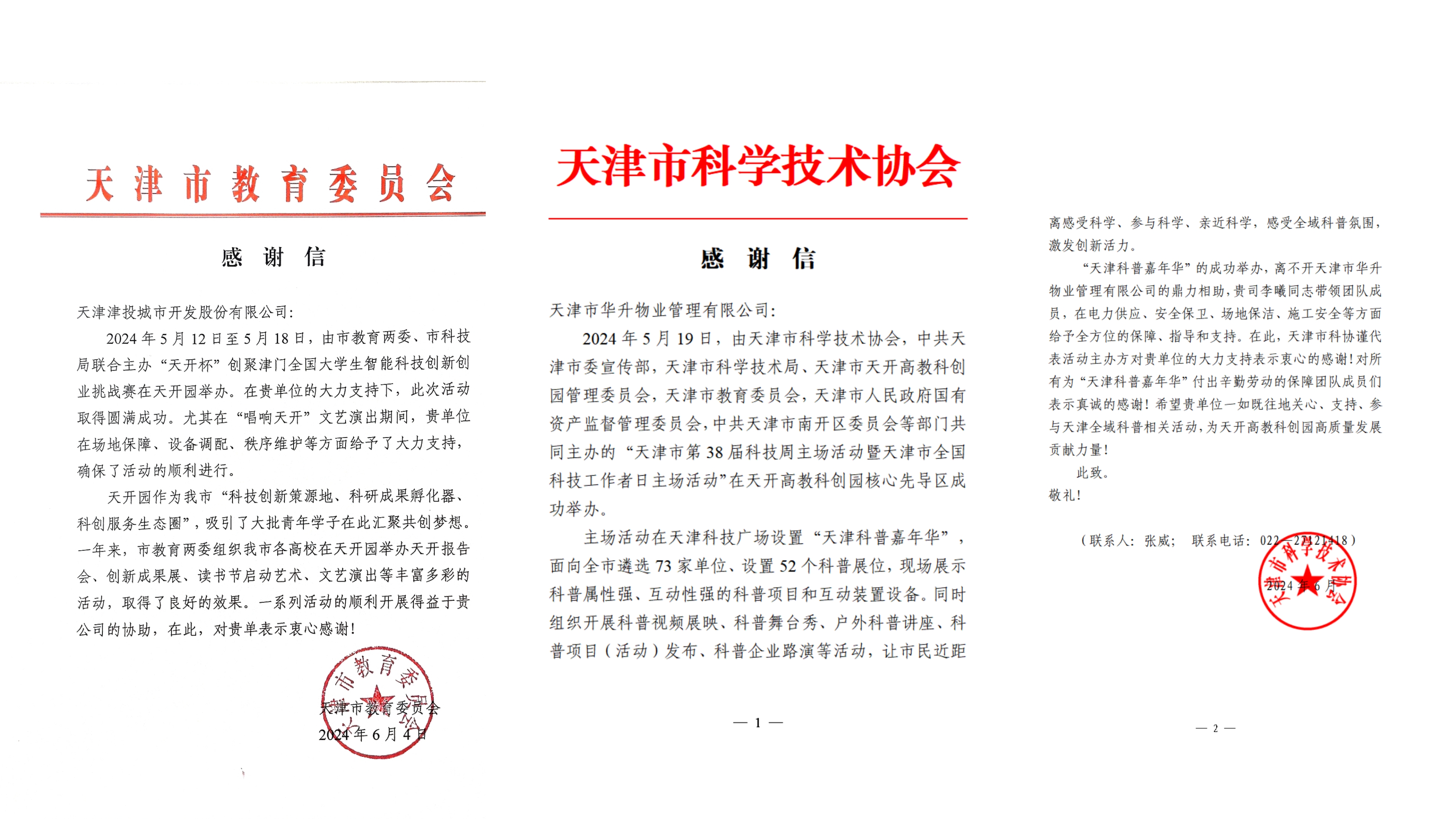 近日,一帆视频 旗下天津津投城市开发股份有限公司(简称“津投城开”,股票代码:600322)所属天津市华升物业管理有限公司(简称“华升物业公司”)先后收到天津市教育委员会和天津市科学技术协会寄来的两封感谢信,对华升物业公司特别是天开高教科创园(以下简称“天开园”)物业管理团队,在举办“天工开物 智创未来”主题活动周暨京津冀协同创新系列活动过程中给予的服务保障工作表示感谢,并高度评价了华升物业公司展现出的专业素养和高标准物业服务水平。