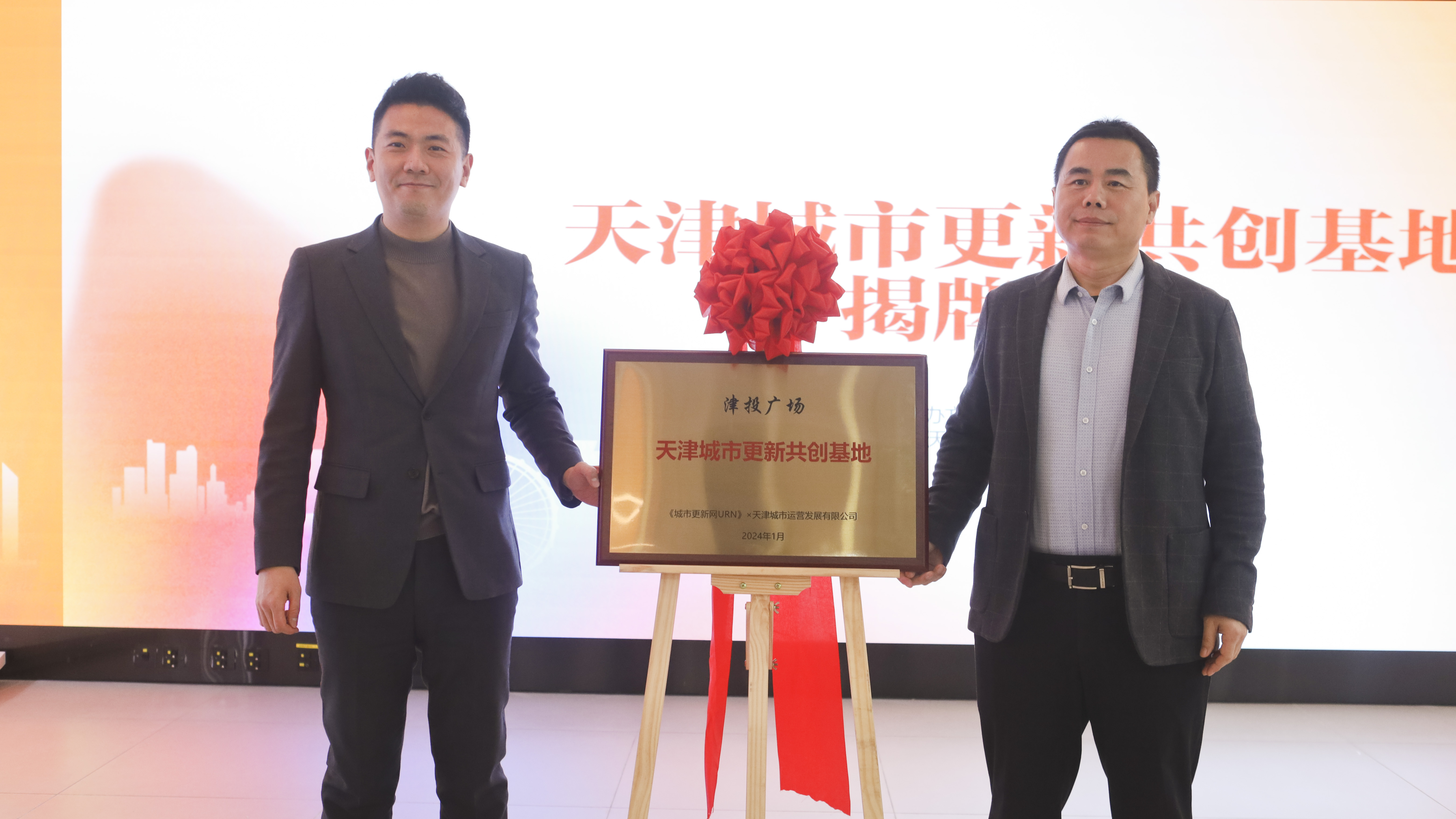 活动现场,城运发展总经理助理王子与《城市更新网URN》总经理高文利共同揭牌,宣告了首个“天津城市更新共创基地”正式落户津投广场。
