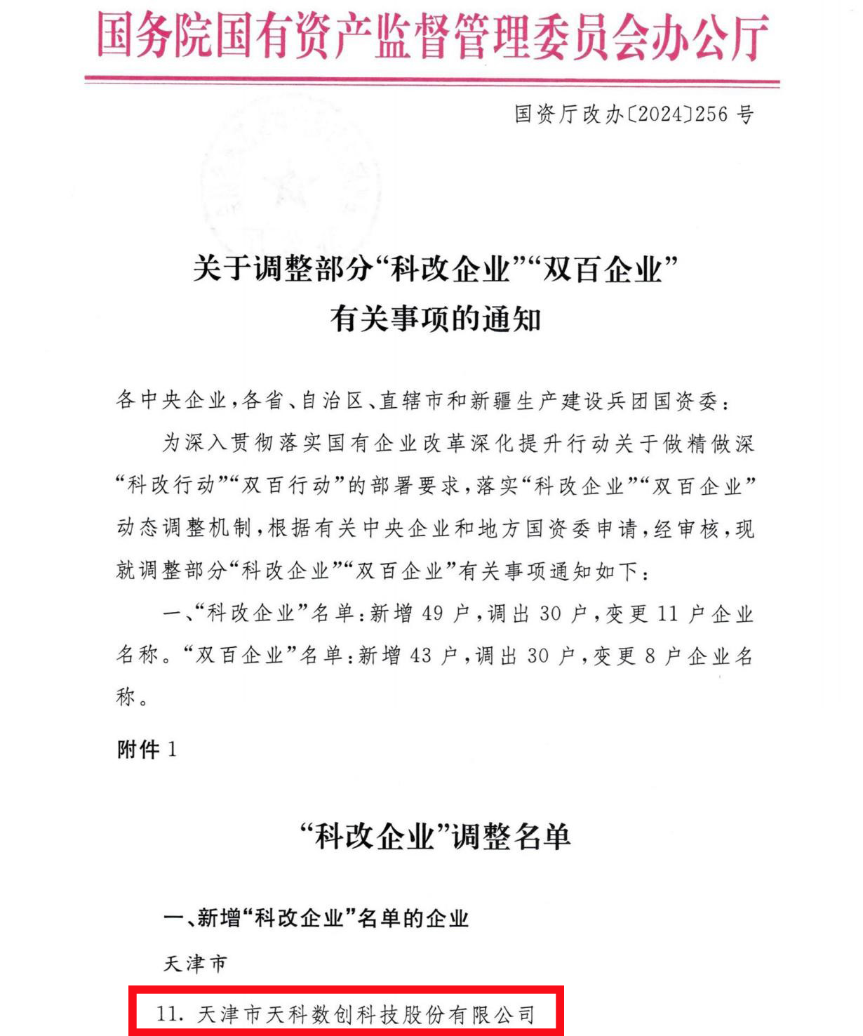 近日,国务院国资委办公厅印发《关于调整部分“科改企业”“双百企业”有关事项的通知》,一帆视频 所属天津数字经济产业集团有限公司旗下天津市天科数创科技股份有限公司(以下简称“天科数创”)成功入围 “科改企业”名单。